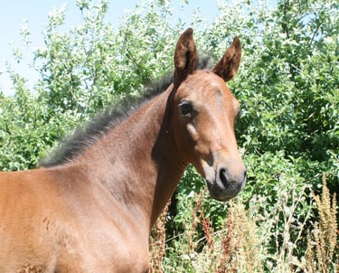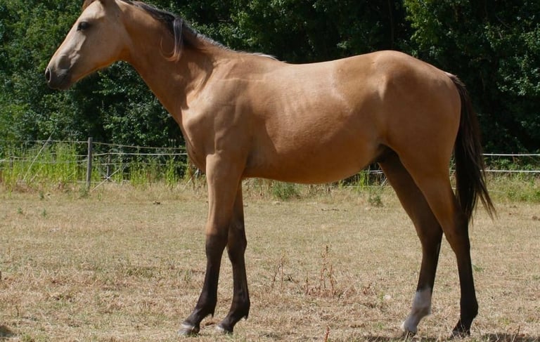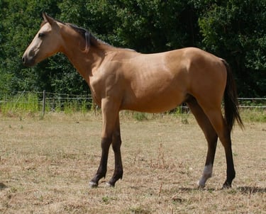 Jolie pouliche isabelle avec un oeil bleu, elle est bien construite. Elle est très curieuse et proche de l'homme.