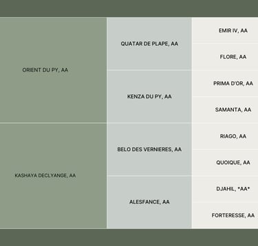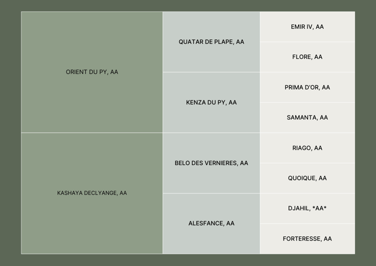 Orient du Py : ISO 156, fut un excellent gagnant en CSI3* GP 1m55. Il s'est notamment illustré sur les épreuves internationales sous la selle de Marie Demonte avant de passer sous la selle de Badr Khiati pour le Maroc. Il est issu d'une génétique d'exception alliant le sang de Quatar de Plape, Prima d'Or et Pancho II. On retrouve dans la souche basse les performers : Etiquette d'Hories ISO 161, Fleur de Rose ISO 146, Crakoukas d'Hories ISO 143, ...